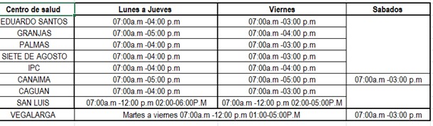 - Sedes Caguán y Fortalecillas: viernes, cada 15 días, de 9:00 a.m. a 10:00 a.m.